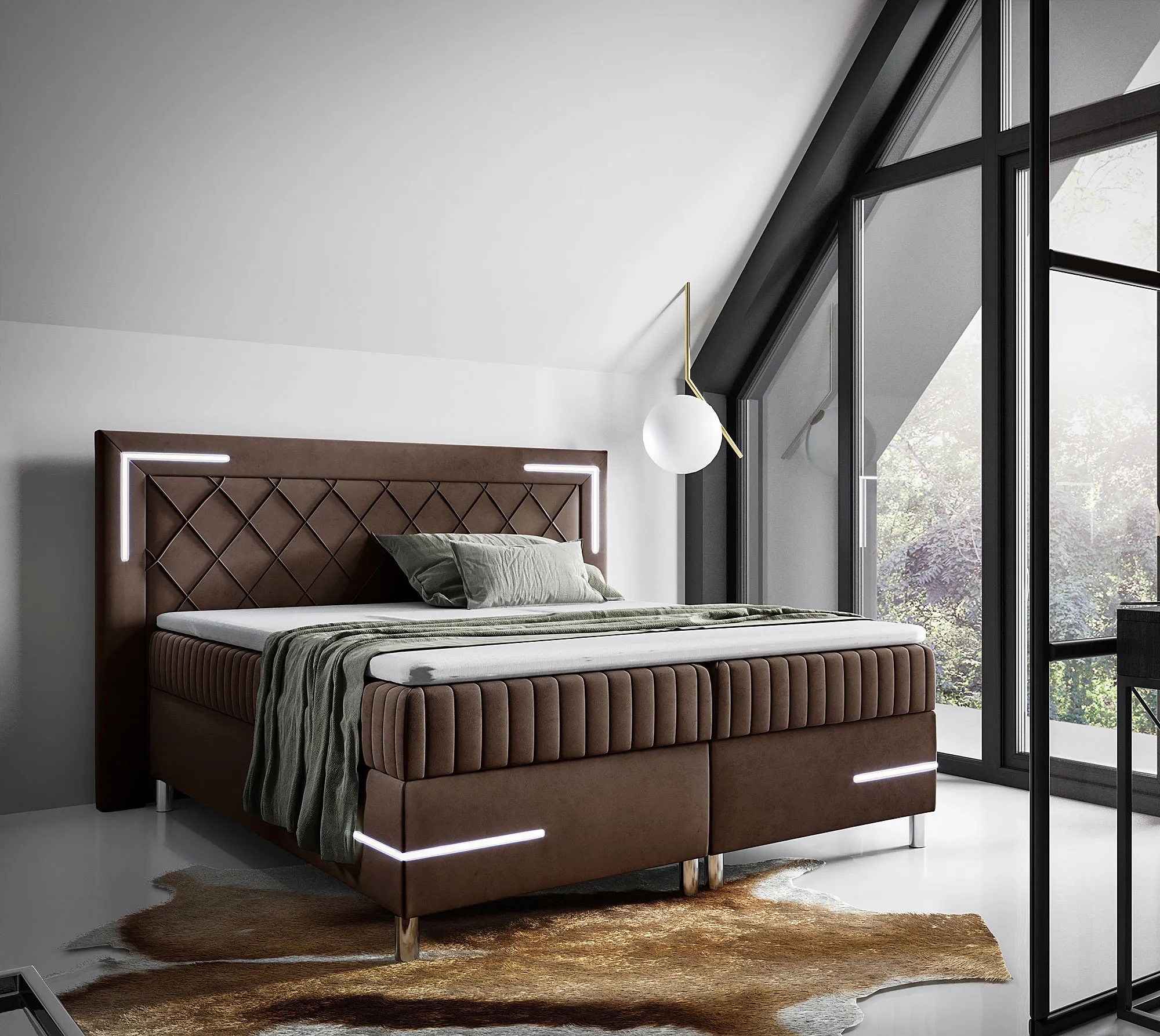Solterro marki Edinos Premium to łóżko kontynentalne zaprojektowane z myślą o osobach ceniących połączenie nowoczesnego designu z maksymalnym komfortem. Charakterystyczne, geometryczne przeszycia na wezgłowiu oraz efektowne oświetlenie LED sterowane pilotem nadają mu wyrazistego, futurystycznego stylu i wprowadzają do sypialni nastrojową atmosferę. Dzięki dwóm pojemnym schowkom na pościel, wygodnemu materacowi bonellowemu oraz miękkiemu topperowi, Solterro zapewnia idealne warunki do regenerującego snu i świetnie sprawdza się w codziennym użytkowaniu.