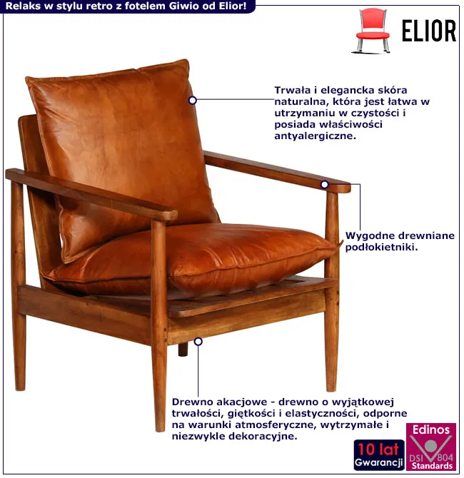 Przenieś wnętrze swojego domu w podróż w czasie z fotelem lisek Piero od marki Elior, który łączy w sobie ponadczasową elegancję z nowoczesnym komfortem. To nie tylko mebel, ale także kawałek historii, który doda Twojemu wnętrzu wyjątkowego uroku. Niech klimat lat 60. zagości na stałe w Twoim salonie, sypialni czy gabinecie, tworząc przestrzeń pełną ciepła i stylu. Kup skórzany fotel wypoczynkowy Piero marki Elior już dziś za jedyne 1248 zł i wprowadź odrobinę retro luksusu do swojego domu!