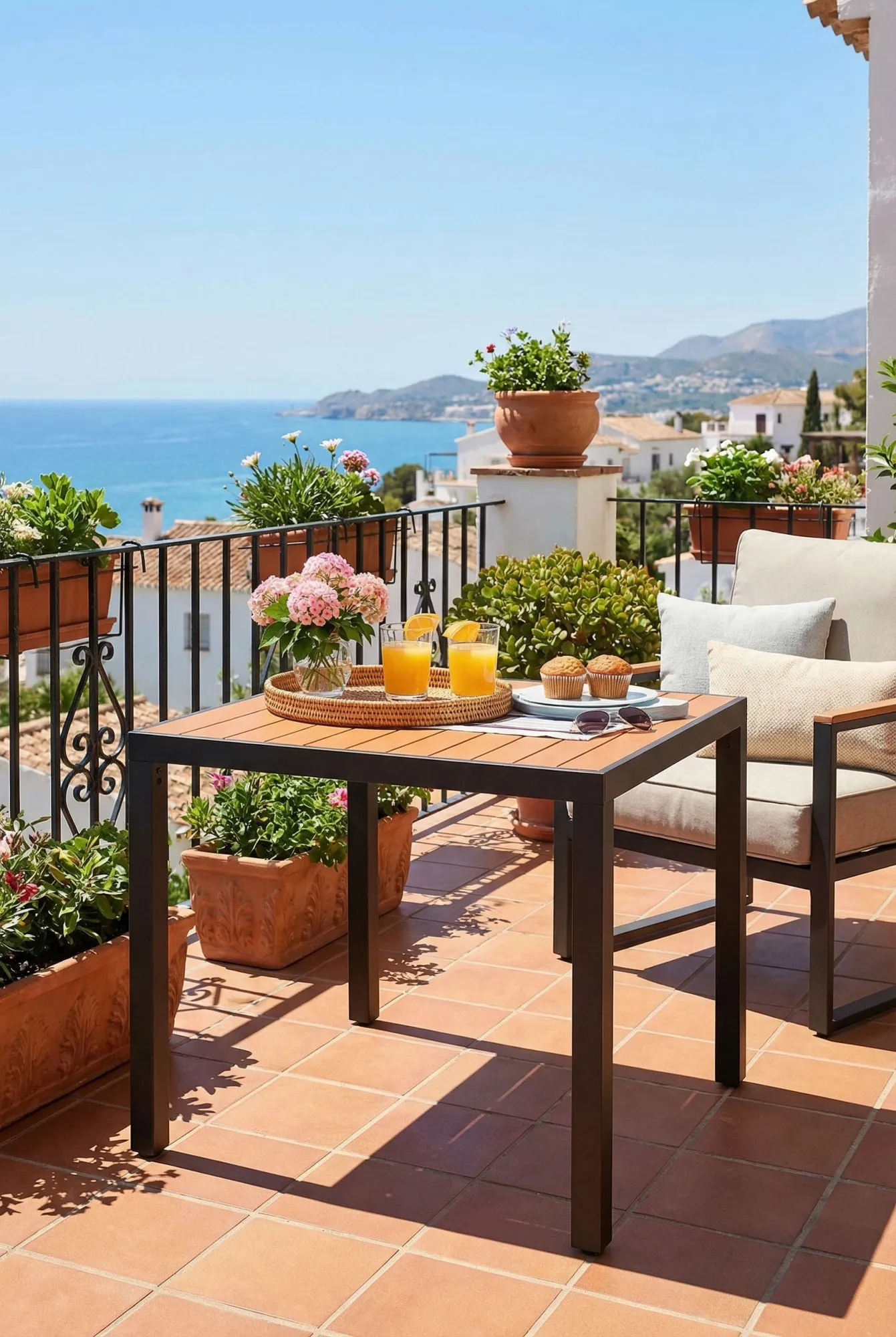Poniżej prezentujemy aranżację tarasu z brązowym kwadratowym stolikiem Maron: