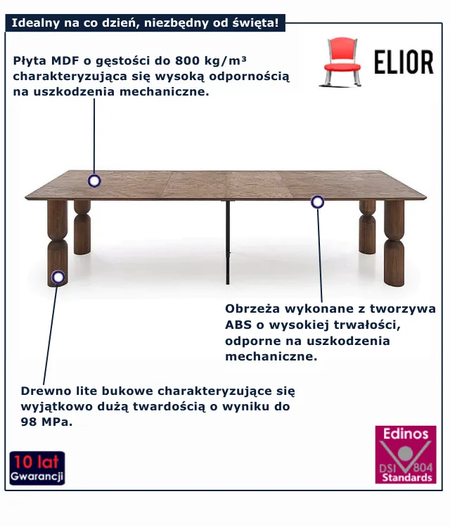 Zainwestuj w stół rozkładany Floe marki Edinos Premium, który jest synonimem stylu, gościnności i mądrego designu. To inwestycja w lata wspaniałych wspólnych posiłków i niezapomnianych spotkań. Nie czekaj i już dziś zadbaj o nowe centrum swojego domu za jedyne 5378 zł! Ciesz się każdą chwilą spędzoną przy stole.