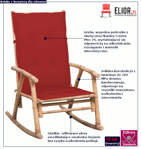 • Kolor fotela: Brązowy, kolor poduszki: czerwony. Szukasz innego fotela bujanego? Kliknij w link i sprawdź fotele bujane w sklepie Edinos.pl. Stwórz swój praktyczny zestaw mebli.