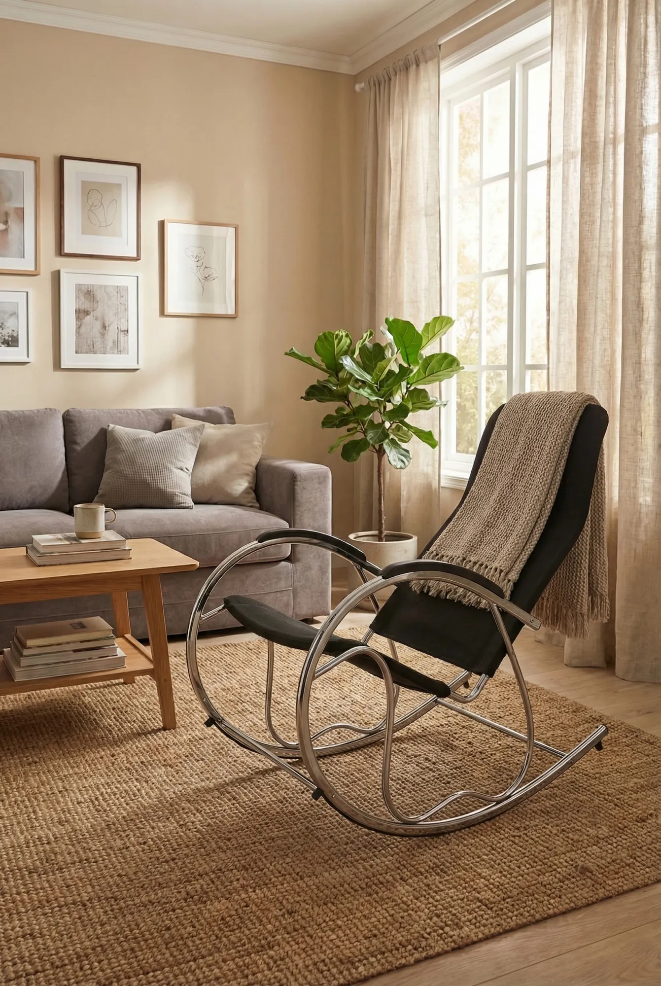Fotel jest bardzo wygodny i od razu stał się moim ulubionym miejscem do relaksu. Konstrukcja jest stabilna, a bujanie daje fajne uczucie odprężenia idealne do odpoczynku po ciężkim dniu. Czarny kolor jest uniwersalny i dobrze komponuje się z innymi meblami w salonie.