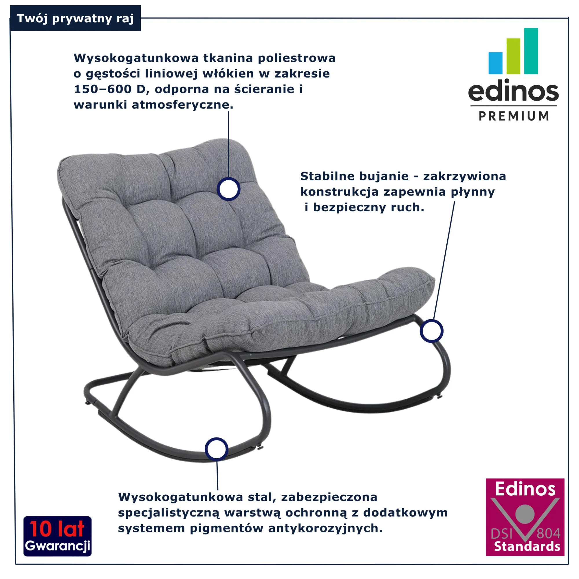 Po długim dniu pracy wystarczy kilka chwil kołysania, aby poczuć przyjemne odprężenie. Fotel bujany Florito marki Edinos Premium może stać się Twoim ulubionym miejscem na poranną kawę, spokojne czytanie książki lub krótką drzemkę w promieniach słońca. To mebel, który wprowadza do codzienności więcej spokoju, wygody i dobrego stylu. A jeśli możesz mieć swój własny kącik relaksu we własnym ogrodzie lub na tarasie, to dlaczego z niego nie skorzystać? Wybierz fotel bujany Florito marki Edinos Premium w cenie 898 zł i pozwól sobie na codzienną chwilę prawdziwego odpoczynku.