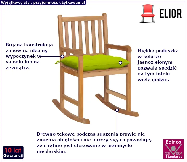 • Kolor: naturalne drewno tekowe oraz jasnozielony. W naszej ofercie posiadamy także inne bujane fotele.