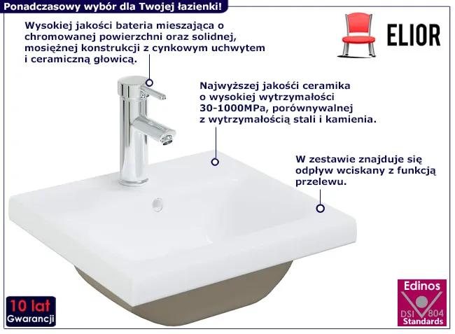 • Zestaw zawiera wszystko, co potrzebne do montażu i użytkowania: umywalkę, baterię oraz odpływ wciskany.