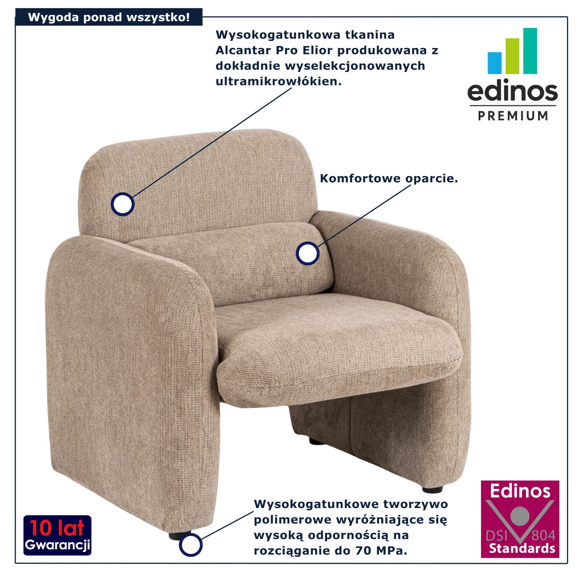 • Produkt posiada certyfikat jakości "Edinos Standards DSI 804", który potwierdza najwyższą jakość wykonania mebla oraz pełny stopień zgodności poszczególnych jednostek wytworzonego wyrobu z przyjętym wzorcem.