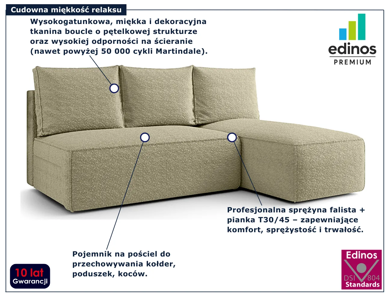 • Tkanina boucle to miękki i dekoracyjny materiał o pętelkowej strukturze oraz wysokiej odporności na ścieranie (nawet powyżej 50 000 cykli Martindale).