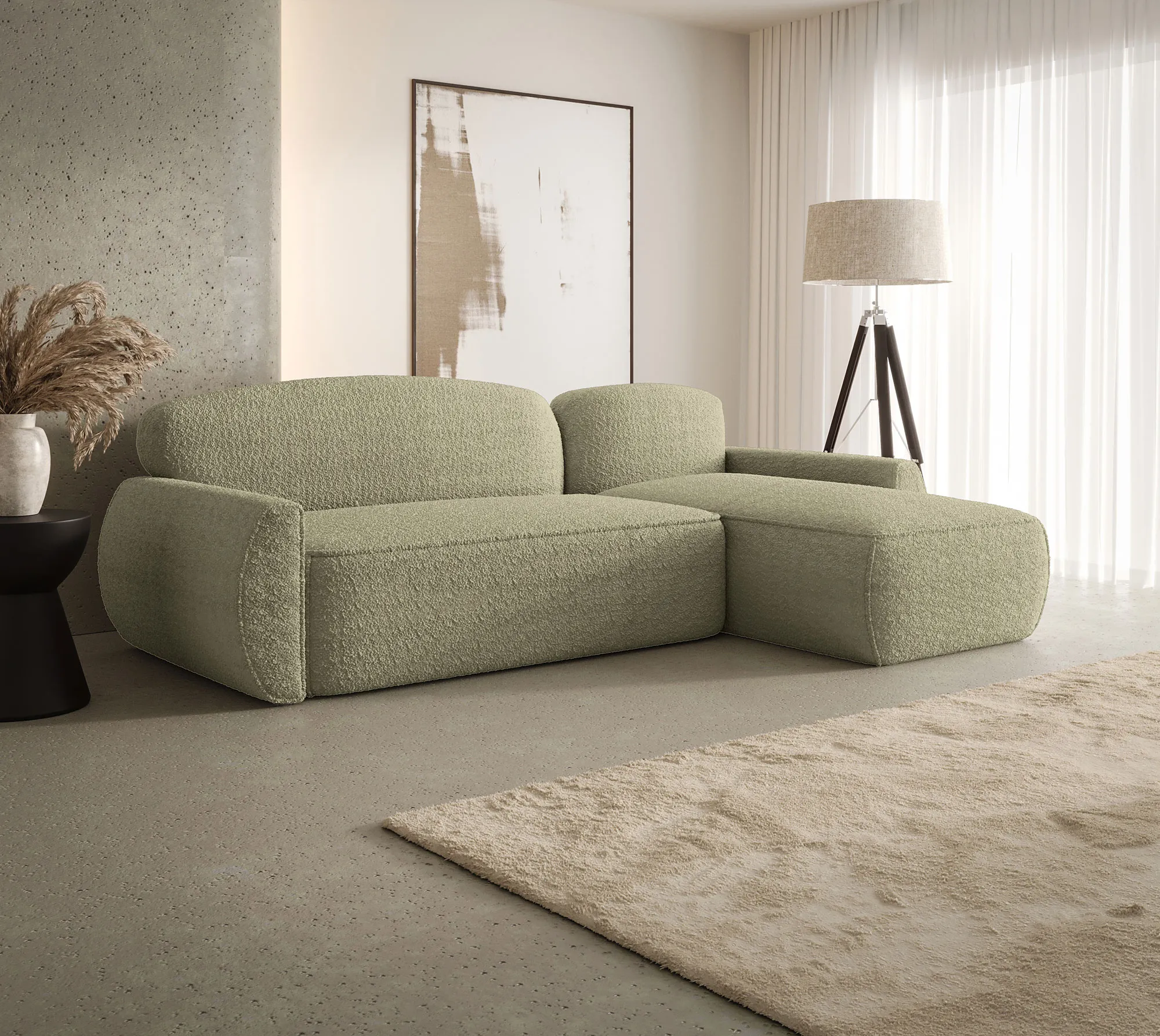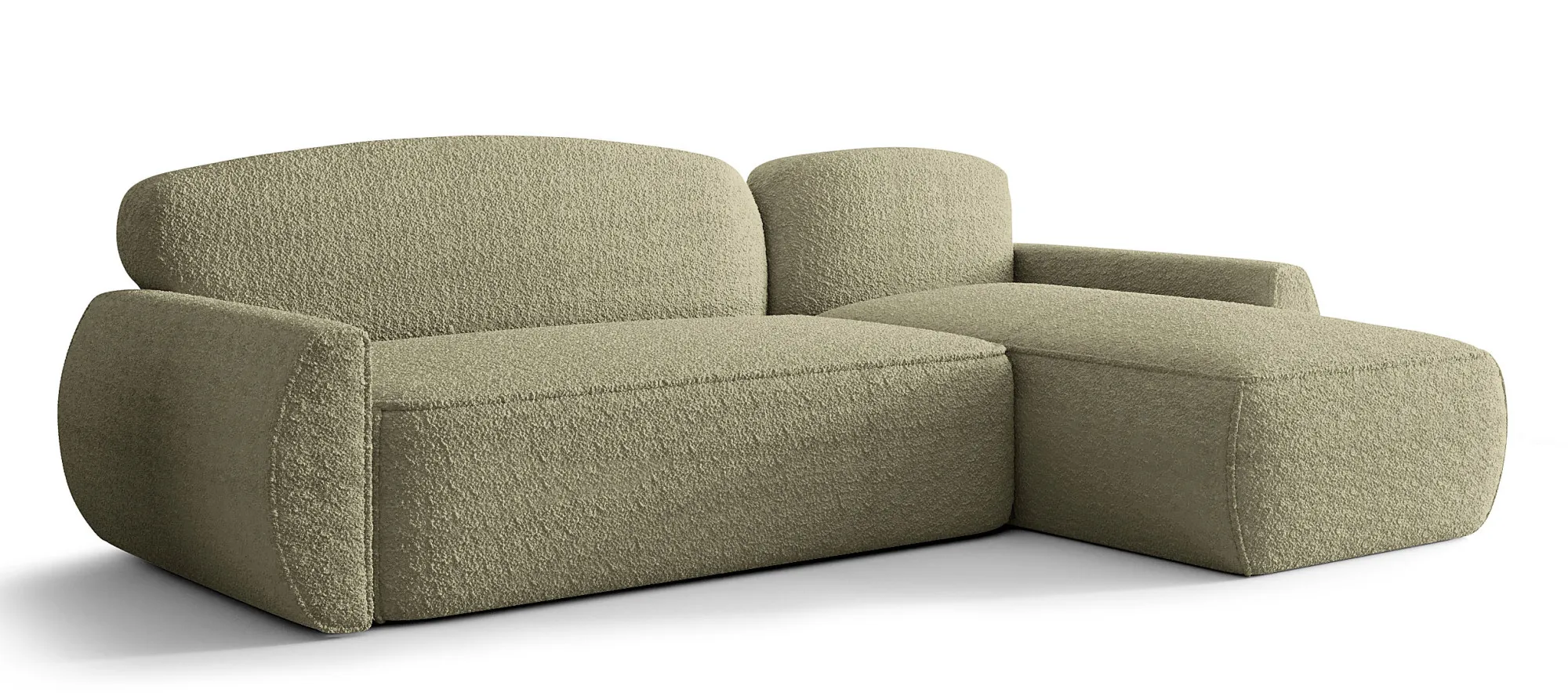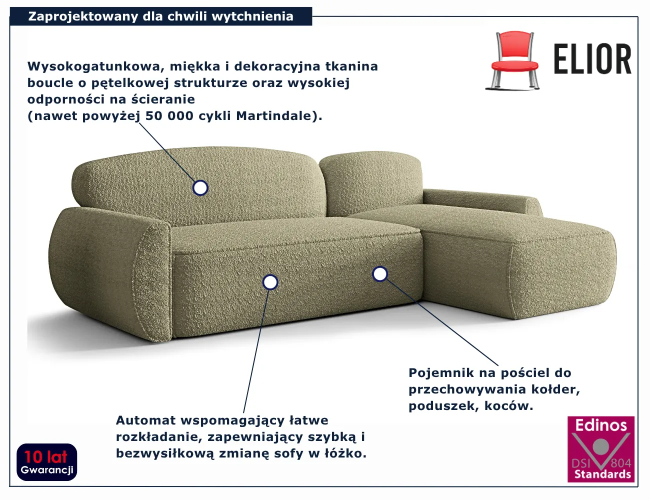 • Tkanina boucle – miękki i dekoracyjny materiał o pętelkowej strukturze, wyjątkowo przyjemny w dotyku i odporny na ścieranie (ponad 50 000 cykli Martindale).