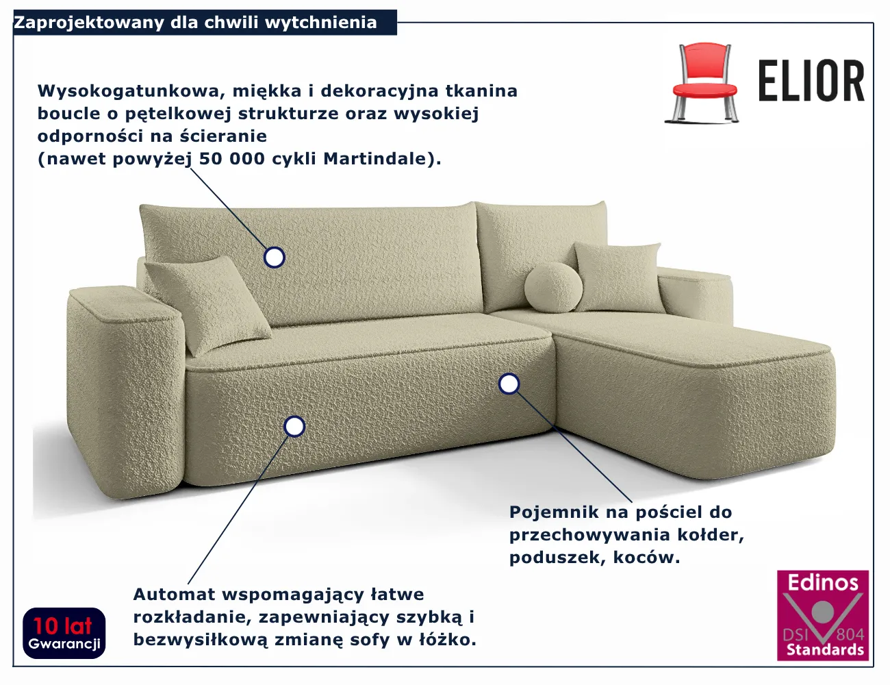 • Tkanina boucle to miękki i dekoracyjny materiał o pętelkowej strukturze oraz wysokiej odporności na ścieranie (nawet powyżej 50 000 cykli Martindale).