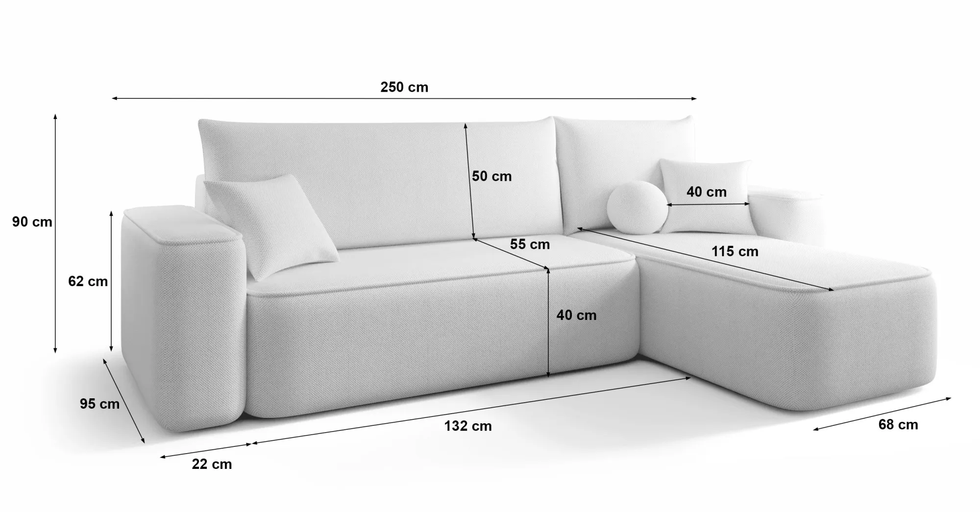 • Szerokość: 250 cm, głębokość: 150 cm, wysokość: 74 cm.