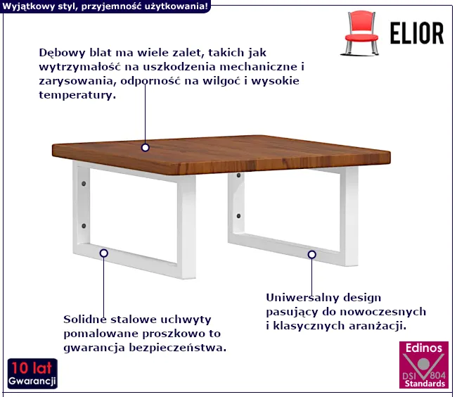 • Produkt posiada certyfikat jakości "Edinos Standards DSI 804", który potwierdza najwyższą jakość wykonania mebla oraz pełny stopień zgodności poszczególnych jednostek wytworzonego wyrobu z przyjętym wzorcem.