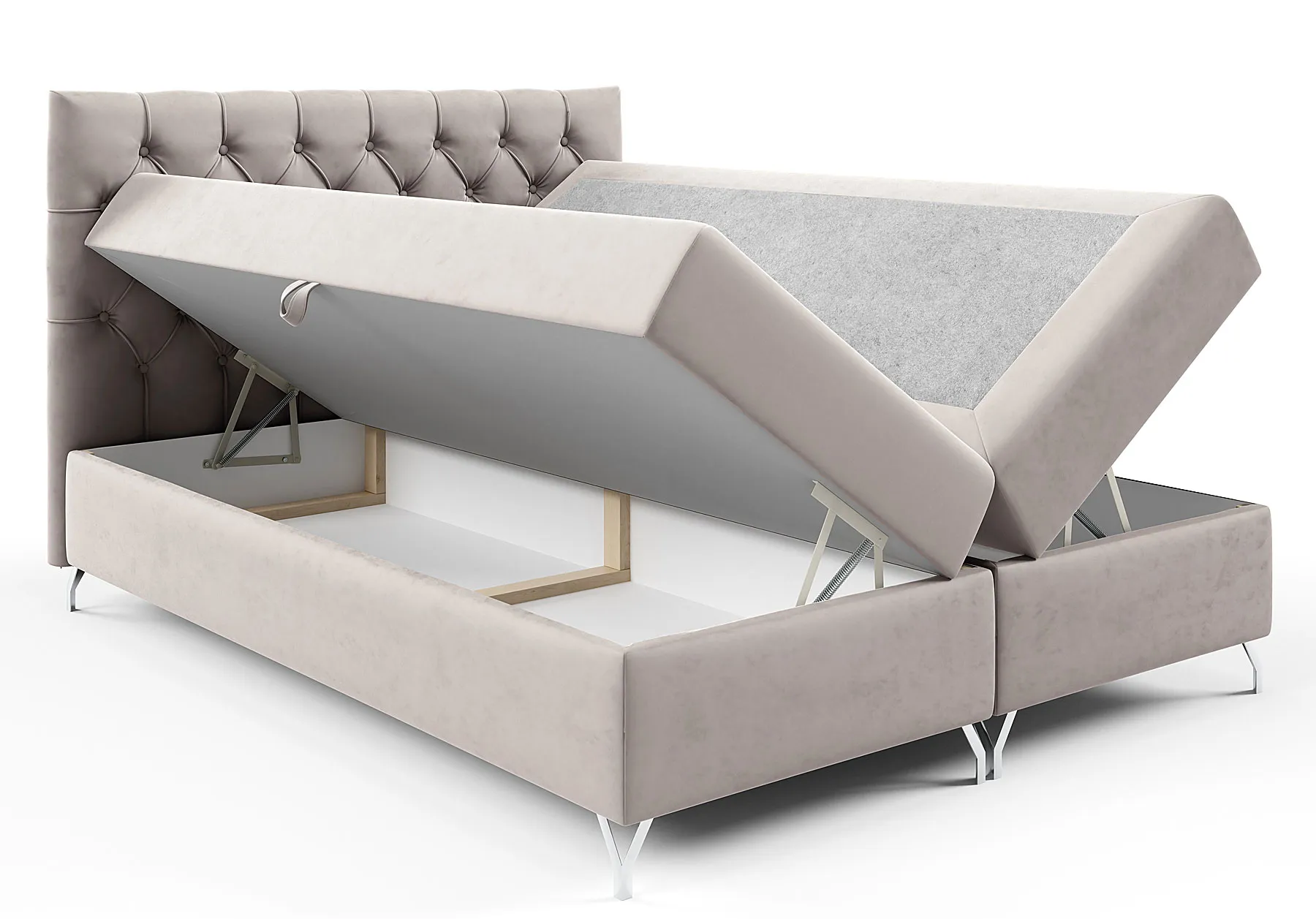 Łóżko kontynentalne Lunavello 3X marki Edinos Premium to propozycja dla osób, które kochają połączenie subtelnego stylu glamour z ponadczasową wygodą. Jego efektownie pikowane zagłowie, zdobione guzikami tapicerowanymi tkaniną, od razu przyciąga wzrok i wprowadza do wnętrza nutę luksusu. Stabilna konstrukcja, dwa pojemne schowki na pościel oraz wygodne otwieranie dzięki sprężynowemu automatowi sprawiają, że Lunavello 3X jest nie tylko piękne, ale przede wszystkim funkcjonalne. Całość dopełniają eleganckie, srebrne nóżki, które dodają meblowi lekkości i klasy.