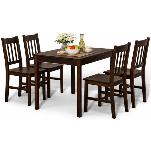 Wymiary krzesła: - Ogólny rozmiar: szerokość – 41,5 cm, długość – 45,5 cm, wysokość – 86 cm - Wysokość siedziska nad ziemią: 44,5 cm - Głębokość siedziska: 39 cm - Wysokość oparcia: 42 cm - Materiał: drewno sosnowe o gęstości do 930 kg/m3 i twardości do 66 MPa w skali Brinella. - Kolor: brązowy. - W skład przesyłki wchodzi 1 stół i 4 krzesła