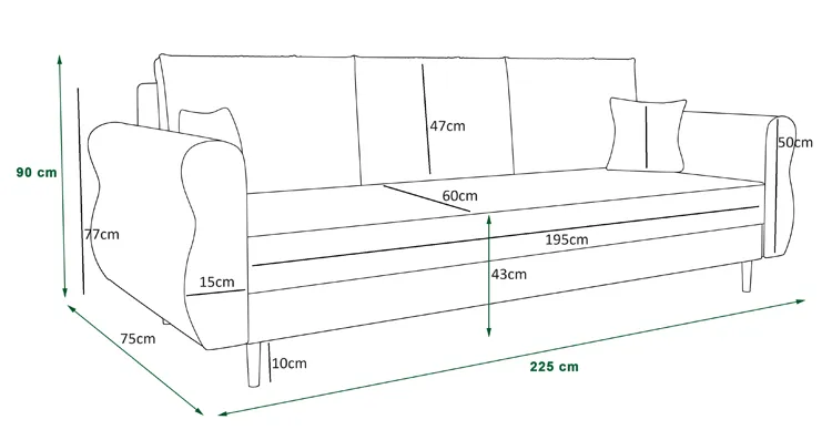 Wymiary całkowite: głębokość: 75 cm, szerokość: 225 cm, wysokość: 90 cm, powierzchnia spania: 130x195 cm