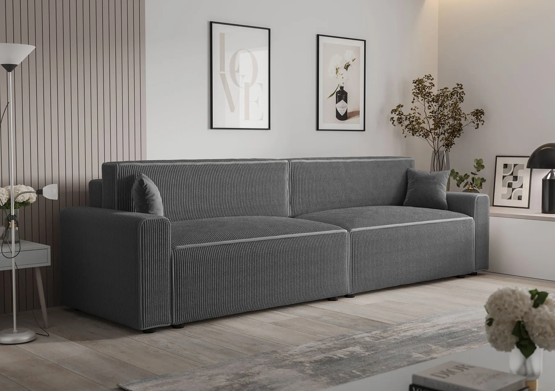 Wizualizacja wnętrza z ciemnoszarą sofą Almoria