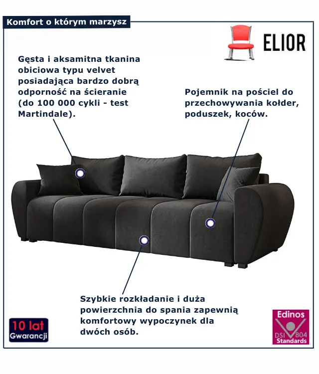 • Tkanina welurowa - miękka w dotyku, efektownie odbija światło, a jednocześnie jest odporna na ścieranie i łatwa w pielęgnacji.