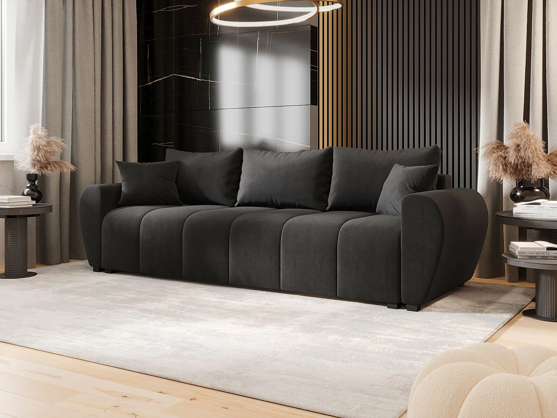 Aranżacja wnętrza z ciemnoszarą sofą Morvani