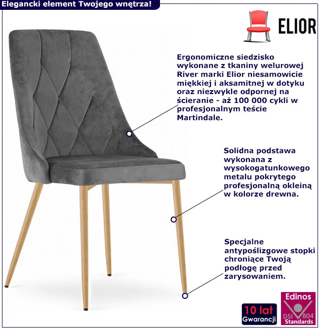 • Wysokiej jakości welur: krzesło Ekis posiada tapicerkę welurową premium River, która jest odporna na ścieranie, z wynikiem testu Martindale wynoszącym 100 000 cykli.