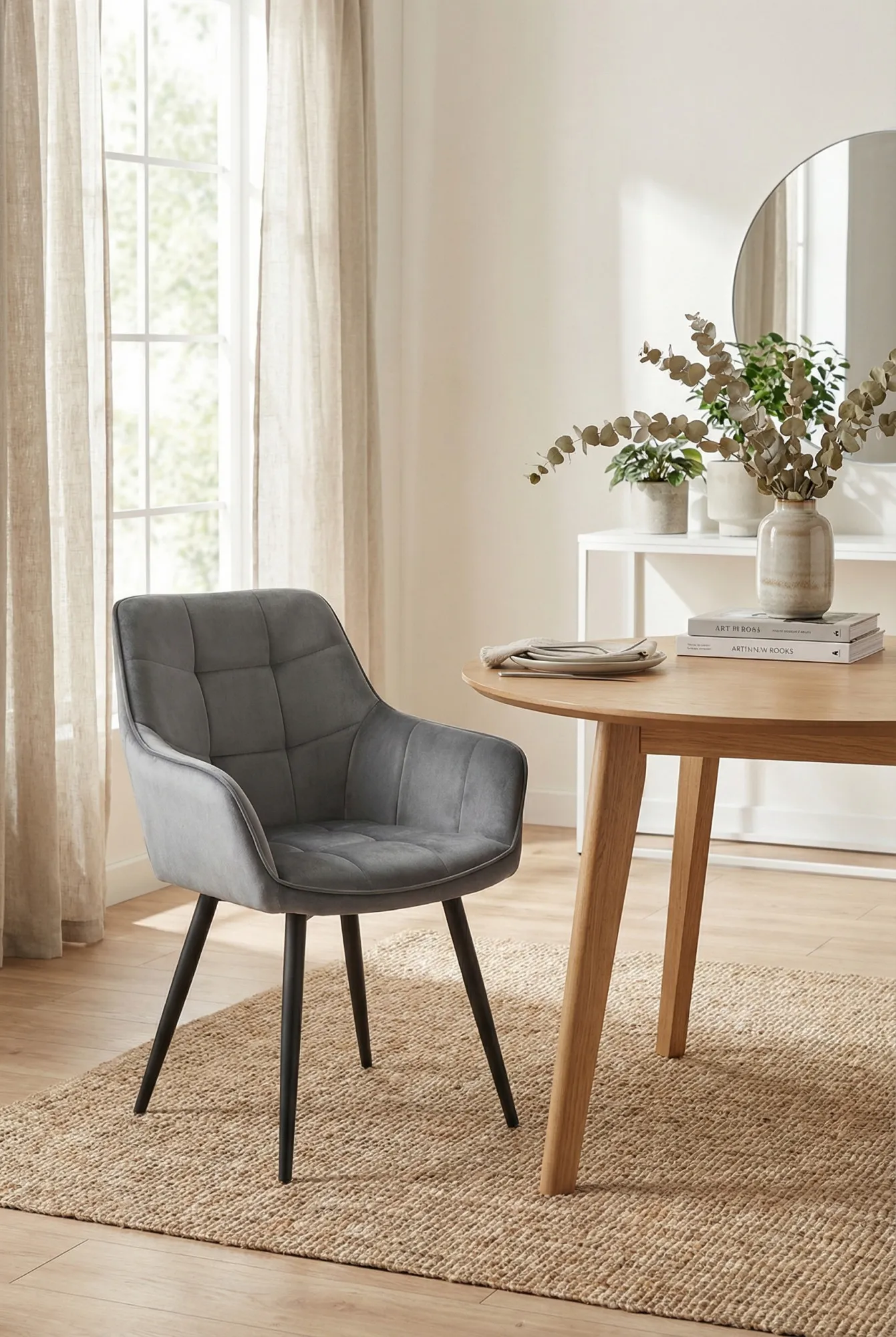 Aranżacja wnętrza z ciemnoszarym welurowym krzesłem Serimi