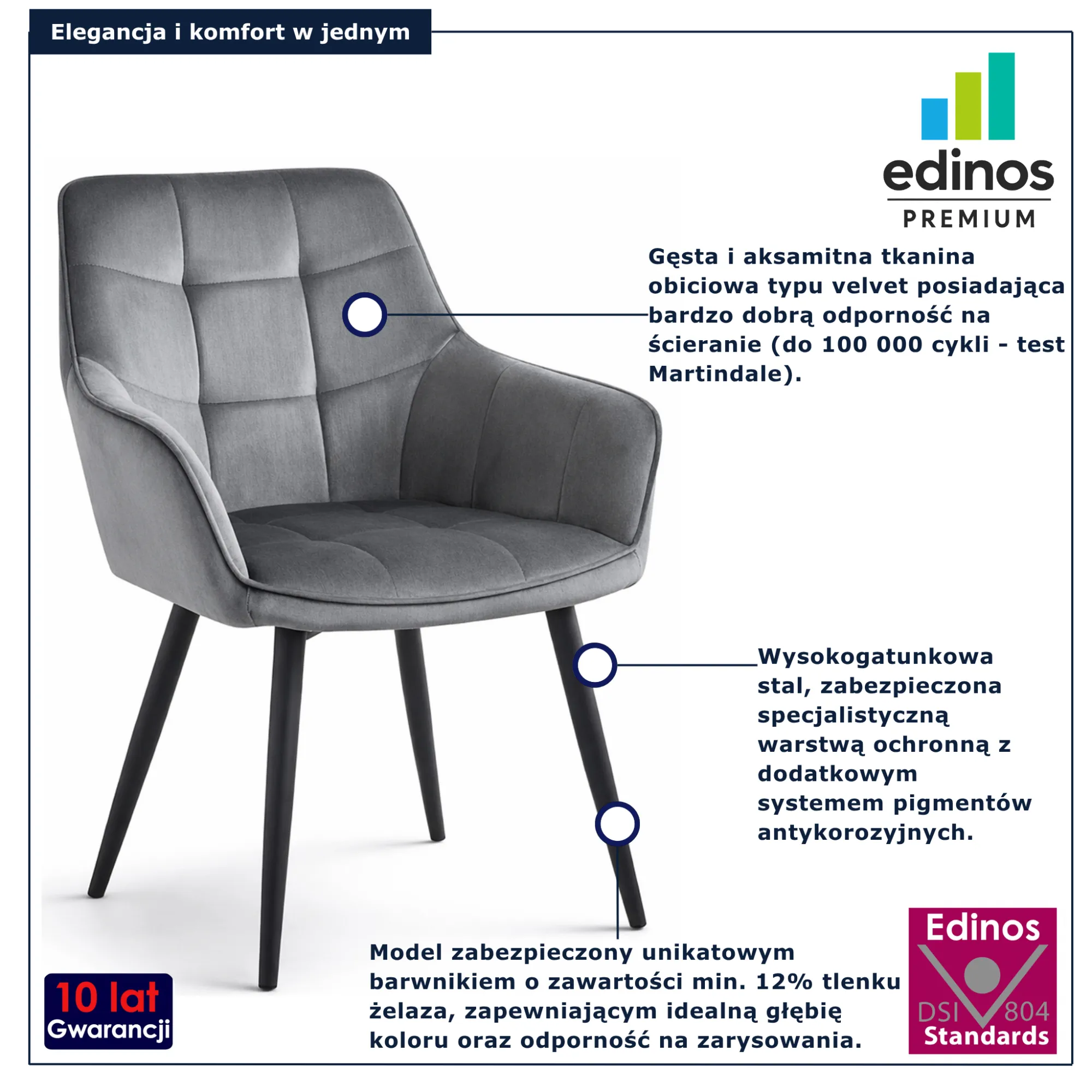 • Produkt posiada certyfikat jakości "Edinos Standards DSI 804", który potwierdza najwyższą jakość wykonania mebla oraz pełny stopień zgodności poszczególnych jednostek wytworzonego wyrobu z przyjętym wzorcem.
