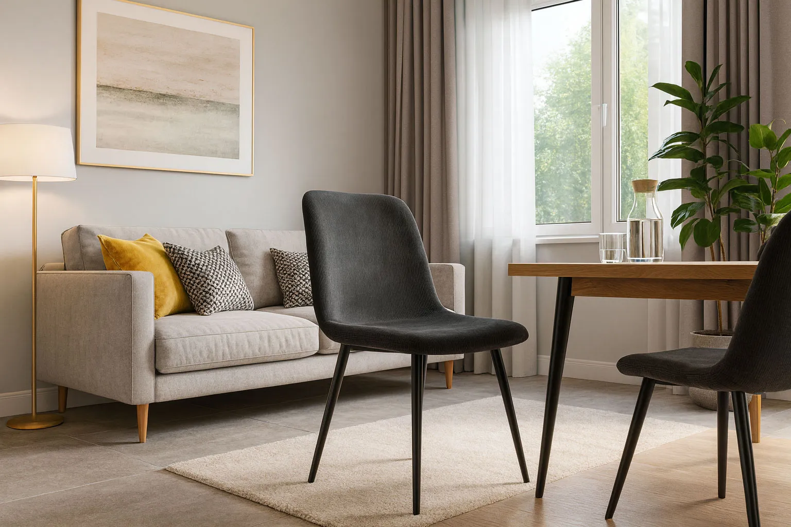 Aranżacja z wykorzystaniem ciemnoszarego krzesła sztruksowego Ruttis 4X