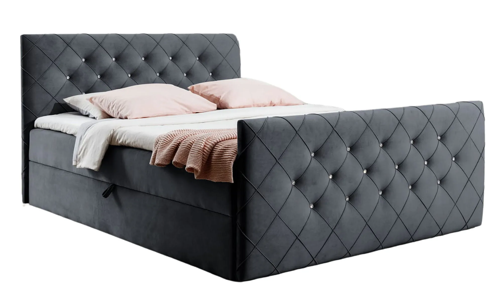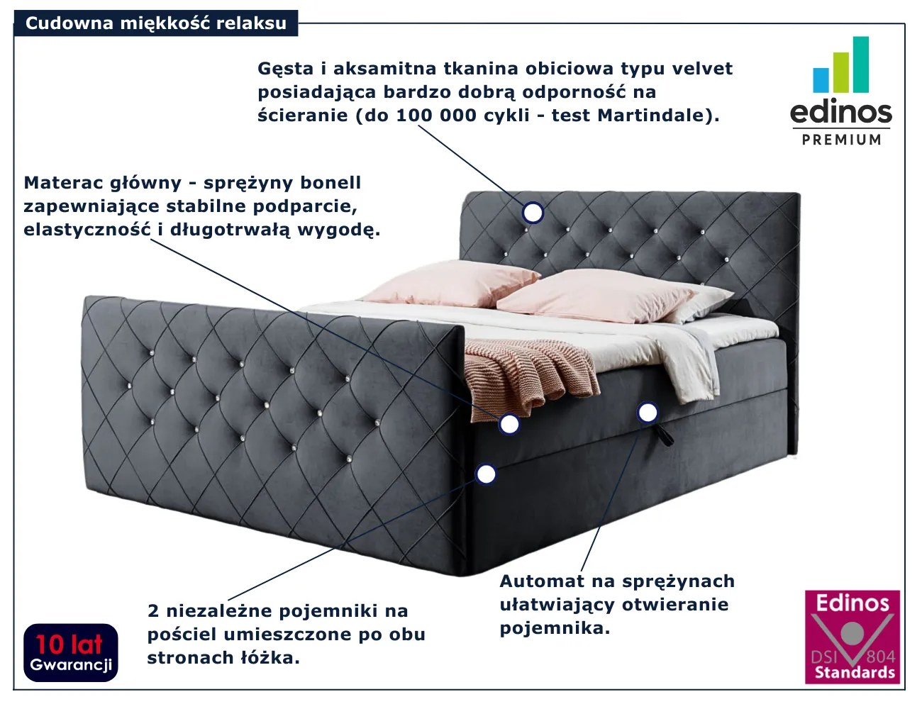 Celivera marki Edinos Premium to łóżko kontynentalne zaprojektowane z myślą o osobach, które pragną wprowadzić do swojej sypialni elegancję w najbardziej dopracowanej formie. Pięknie pikowane wezgłowie oraz front łóżka, wzbogacone subtelnymi kryształkowymi detalami, tworzą wyjątkowo dekoracyjny efekt, który od razu przyciąga wzrok. Praktyczny pojemnik na pościel, wygodny materac bonellowy oraz miękki topper zapewniają idealne warunki do snu, dbając zarówno o komfort, jak i funkcjonalność codziennego użytkowania. Celivera to połączenie wyrazistego stylu glamour i wygody premium, która czyni każdy wieczór czystą przyjemnością.