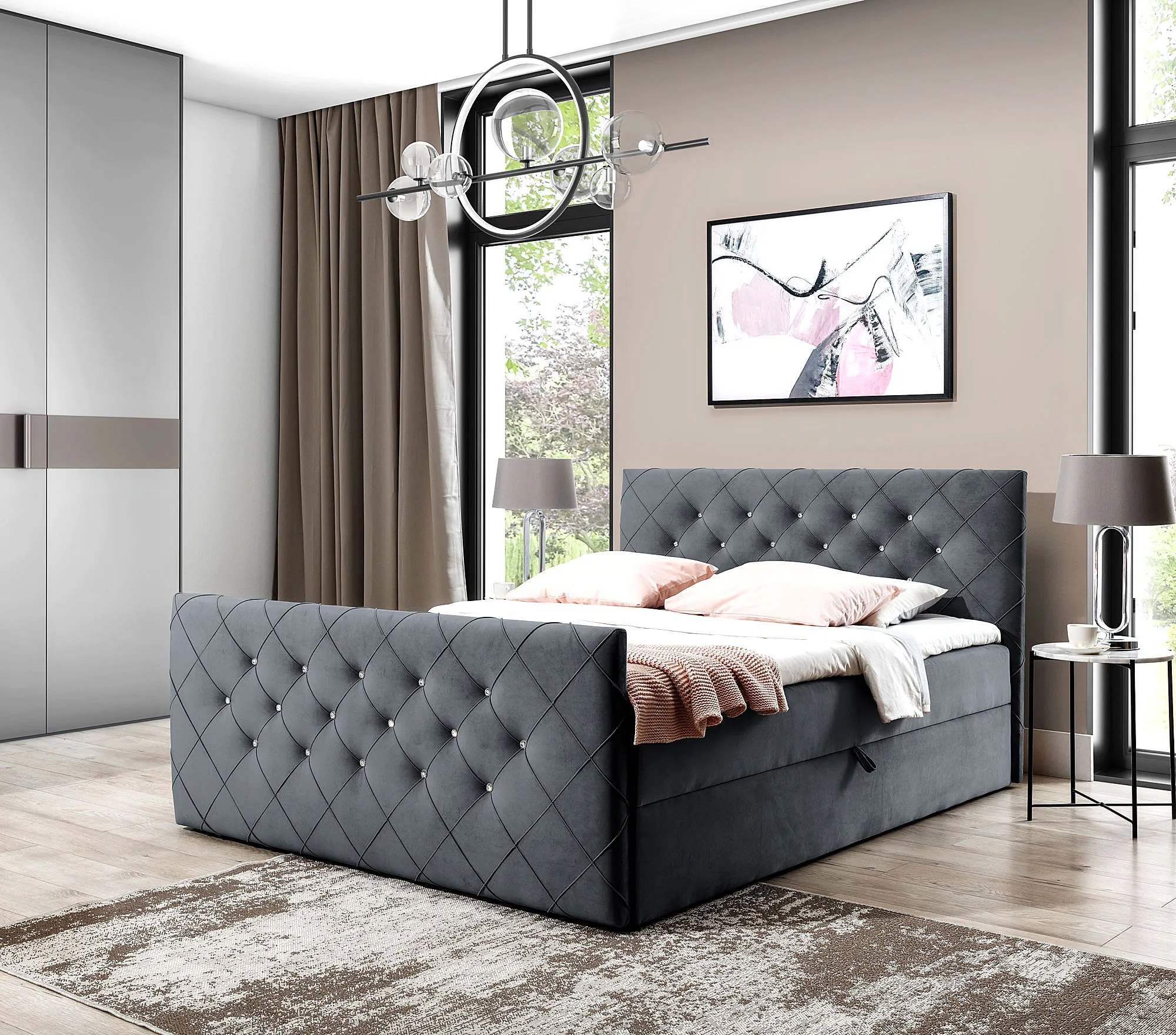 Aranżacja wnętrza z ciemnoszarym łóżkiem kontynentalnym Celivera