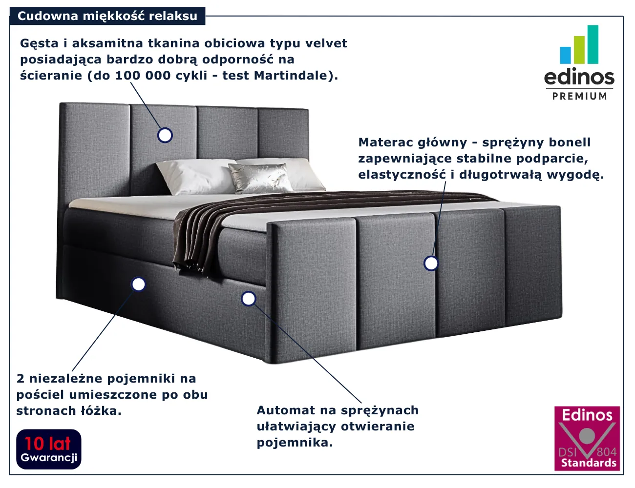 Wybierając Meravino 3X marki Edinos Premium, zyskujesz nie tylko eleganckie łóżko kontynentalne, ale przede wszystkim wygodę, która codziennie realnie wpływa na jakość Twojego wypoczynku. To mebel, który wprowadza do sypialni ład, styl i funkcjonalność, a Tobie daje poczucie pełnego relaksu. Przekonaj się jak wiele zmienia komfortowy sen!