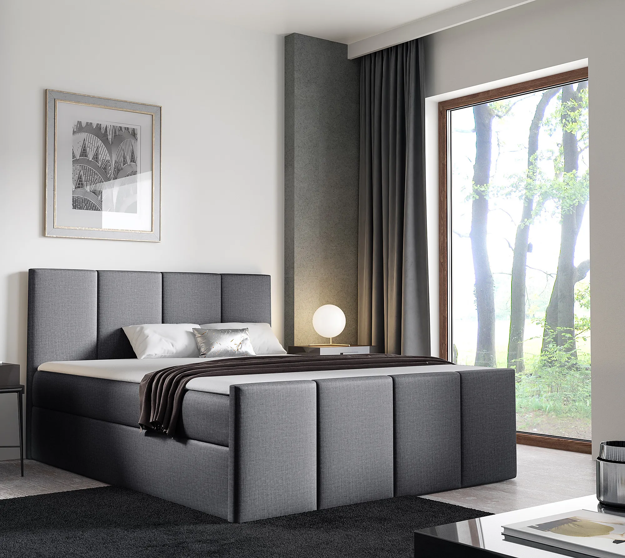 Aranżacja wnętrza z ciemnoszarym łóżkiem Elarivo