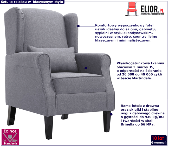 Jasnoszary fotel uszak Charlene marki Edinos Premium wyróżnia się nie tylko ponadczasową formą, ale także zastosowaniem materiałów najlepszej jakości. Designerska tapicerka to wysokogatunkowa tkanina obiciowa z kolekcji Inaros 3S. Inaros 3S to specjalistyczna tkanina o wysokiej odporności na ścieranie od 20 000 do 40 000 cykli w teście Martindale. Aż 50% procentowa zawartość naturalnej bawełny zapewnia doskonały wygląd oraz właściwości antyalergiczne. Ponadto tkanina Inaros 3S jest wolna od substancji szkodliwych w stężeniach mających negatywny wpływ na stan zdrowia człowieka m.in. pestycydów, chlorofenoli, formaldehydu, barwników alergizujących oraz zabronionych barwników azowych. Do wykonania fotela Charlene wykorzystano specjalistyczną gąbkę tapicerską o ustandaryzowanych parametrach, dedykowaną do do wypełnienia foteli, oparć i zagłówków wymagających jakości wyższej niż przeciętna. Rama fotela wykonana z naturalnego drewna i sklejki opiera się solidnych nogach z dębowego drewna o wysokiej twardości i gęstości w do 930 kg/m3 i twardością w skali Brinella na płaszczyźnie podłużnej do 66 MPa. Drewniane nogi zostały starannie zabezpieczone hipoalergiczną wodną substancją w kolorze klasycznej czerni, chroniącą drewno przed przetarciem i zarysowaniem. Zastosowanie tak wysokiej jakości materiałów wraz z precyzyjnie zaprojektowaną ergonomiczną konstrukcją, stawia fotel Charlene w światowej czołówce mebli wypoczynkowych. Wieloletnia trwałość, wybitne możliwości aranżacyjne i ponadprzeciętna wygoda to tylko kilka, z licznych zalet tego genialnego mebla. Postaw fotel Charlene marki Edinos Premium w swoim wnętrzu, zanurz się jego przytulne ramiona i zamień swoje cztery katy w oazę komfortu i sielskiego spokoju.
