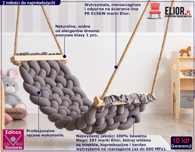 Ponieważ projektanci marki Elior sami są rodzicami, przy tworzeniu hamaku Hiroki dołożyli wszelkich starań, aby wyróżniał się on jakością na najwyższym poziomie. Bezpieczeństwo najmłodszych użytkowników stało się punktem przewodnim. Hamak w całości wykonany został ze starannie wyselekcjonowanych, wysokogatunkowych materiałów. Miękkie i niezwykle stylowe siedzisko to 100% bawełna Magic 3XT marki Elior. Materiał ten wyróżnia się ponadprzeciętną odpornością na uderzenia, naciąganie czy długotrwałe obciążenie. Do tego jest odporny na zabrudzenia oraz wilgoć. Zapewniamy Cię, że bawełna Magic 3XT marki Elior nie uczula, zapewnia skórze przewiewność, łatwo się pierze i jest bardzo miła w dotyku. Jego wypełnienie to wysokogatunkowy puch syntetyczny wytworzony z odpowiednio ukształtowanych włókien poliestrowych, których zadaniem jest utrzymanie sprężystości i stworzenie szeregu komór powietrznych dbających o termikę. Włókna poliestrowe nie chłoną nadmiernie wilgoci i w kontakcie z wodą sprawują się dużo lepiej niż naturalny puch. Puch wykorzystany do stworzenia hamaku Hiroki wyróżnia się także wysoką sprężystością - aż 700 cuin. Całość utrzymuje się na grubych, wytrzymałych i odpornych na ścieranie linach przymocowanych do naturalnego drewna sosnowego. Dokładnie szlifowana powierzchnia materiału zabezpieczona została naturalnym impregnatem ochronnym, całkowicie wolnym od formaldehydu, który chroni przed zarysowaniem oraz przetarciem drewna. Dzięki temu jest dobrze tolerowane przez alergików oraz osoby wrażliwe i co najważniejsze - mają neutralny wpływ na zdrowie Twojego dziecka w przeciwieństwie do innych produktów konkurencji.
