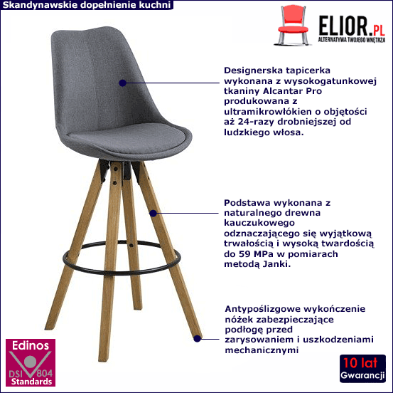 Designerska tapicerka hokera została wykonana z wysokogatunkowej tkaniny Alcantar Pro, która jest trwała, łatwo się czyści i elegancko prezentuje. Ponadto charakteryzujące się dużą odpornością na ścieranie i zabrudzenia oraz niezwykłą miękkością w dotyku. Tkanina Alcantar Pro, która jako jedyna na rynku produkowana jest z dokładnie wyselekcjonowanych ultramikrowłókien o objętości aż 24- razy drobniejszej od ludzkiego włosa, charakteryzuje się wyjątkową żywotnością, odpornością oraz niezwykłą łatwością w utrzymaniu. Posiada ponadprzeciętne cechy wytrzymałościowe, dzięki czemu unikniesz co sezonowej wymiany tapicerki. Siedzisko jest bardzo ważne jeżeli bierzemy pod uwagę miejsce do siedzenia w kuchni lub jadalni, w której spędzamy dużo czasu. podczas użytkowania tego typu mebla bardzo istotna jest również podstawa, zapewniająca Ci bezpieczeństwo i całkowitą stabilność. Właśnie takie zalety uzyskasz przy pomocy pewnych i sprawdzonych materiałów, jakim jest między innymi naturalne i trwałe drewno kauczukowe. Ten rodzaj drewna odznacza się wyjątkową trwałością i wysoką twardością do 59 MPa w pomiarach metodą Janki. Drewno kauczukowe charakteryzuje się jednolitym, jasnym usłojeniem i regularnym układem włókien, co w połączeniu z jego wysokimi parametrami jakościowymi tworzy doskonały materiał do wyrobu mebli. Ponadto nogi hokera zostały uszlachetnione o antypoślizgowe wykończenie zabezpieczające podłogę przez zarysowaniami i uszkodzeniami mechanicznymi.