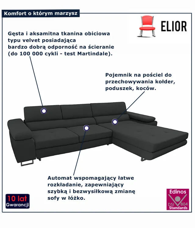 Narożnik Grenvo marki Elior to nie tylko stylowy element wystroju, ale przede wszystkim praktyczne rozwiązanie, które ułatwia codzienne funkcjonowanie. Zyskujesz przestrzeń do relaksu, snu i spotkań z bliskimi, a jednocześnie mebel, który nada Twojemu salonowi wyjątkowego charakteru. Wybierz narożnik Grenvo i ciesz się komfortem każdego dnia w cenie 4338 zł.