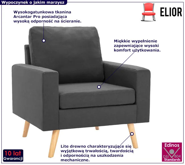 - Solidna konstrukcja: drewniane nogi zapewniają stabilność i wytrzymałość, dzięki czemu fotel jest nie tylko stylowy, ale również solidny.