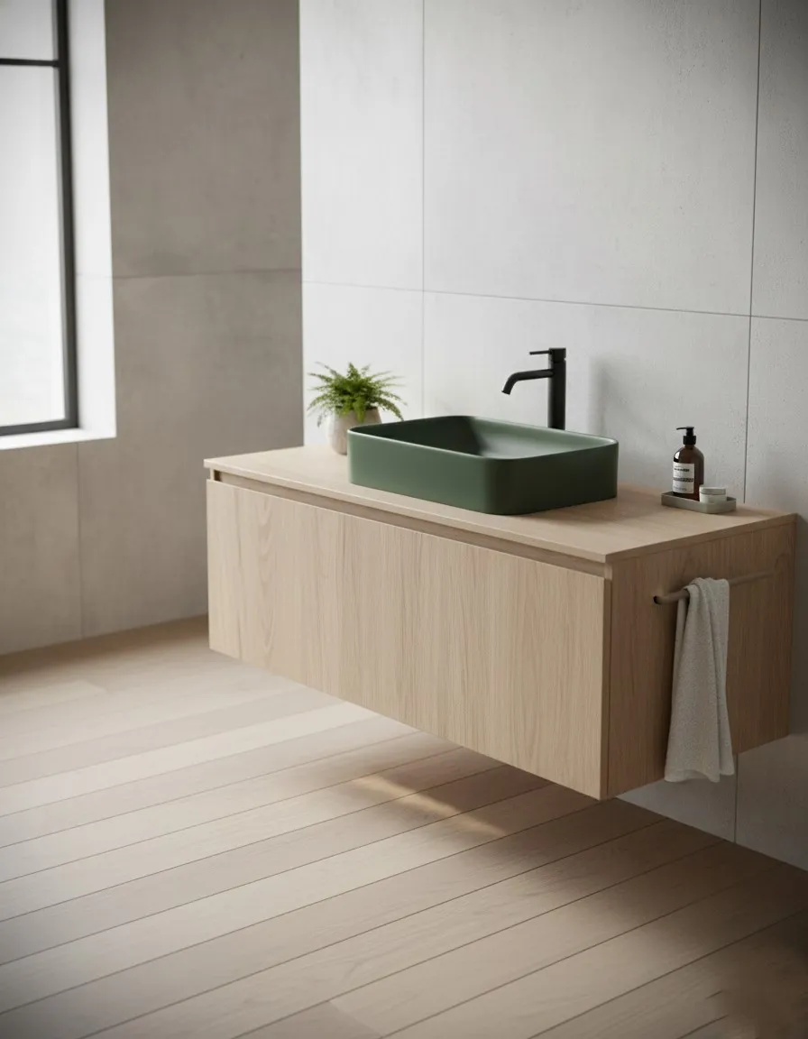 Umywalka ma prostokątny kształt i ciemnozielony kolor, który wyróżnia ją na tle standardowych modeli. Jej forma jest prosta i nowoczesna, dzięki czemu może pasować do różnych aranżacji łazienki.