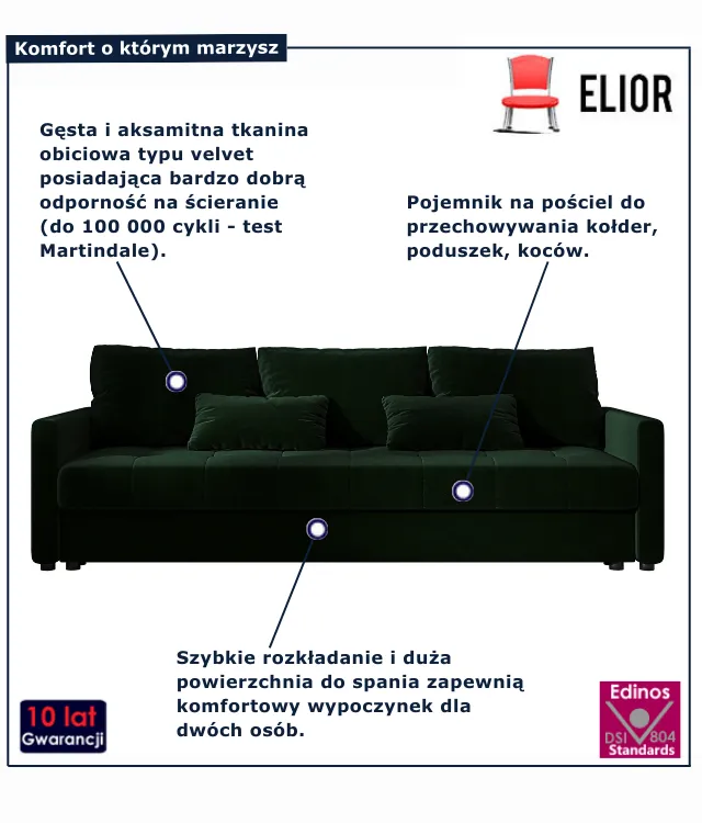• Funkcja spania - w kilku prostych ruchach sofa zmienia się w wygodne łóżko z równą, przestronną powierzchnią, zapewniając miejsce dla domowników i gości.