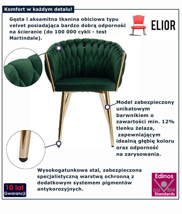 • Produkt posiada certyfikat jakości "Edinos Standards DSI 804", który potwierdza najwyższą jakość wykonania mebla oraz pełny stopień zgodności poszczególnych jednostek wytworzonego wyrobu z przyjętym wzorcem.