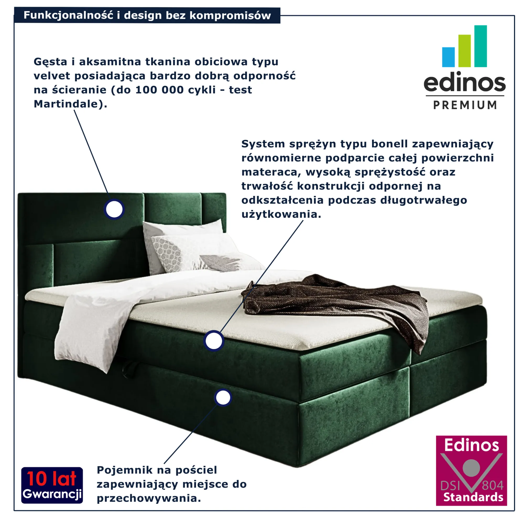 • Produkt posiada certyfikat jakości "Edinos Standards DSI 804", który potwierdza najwyższą jakość wykonania mebla oraz pełny stopień zgodności poszczególnych jednostek wytworzonego wyrobu z przyjętym wzorcem.