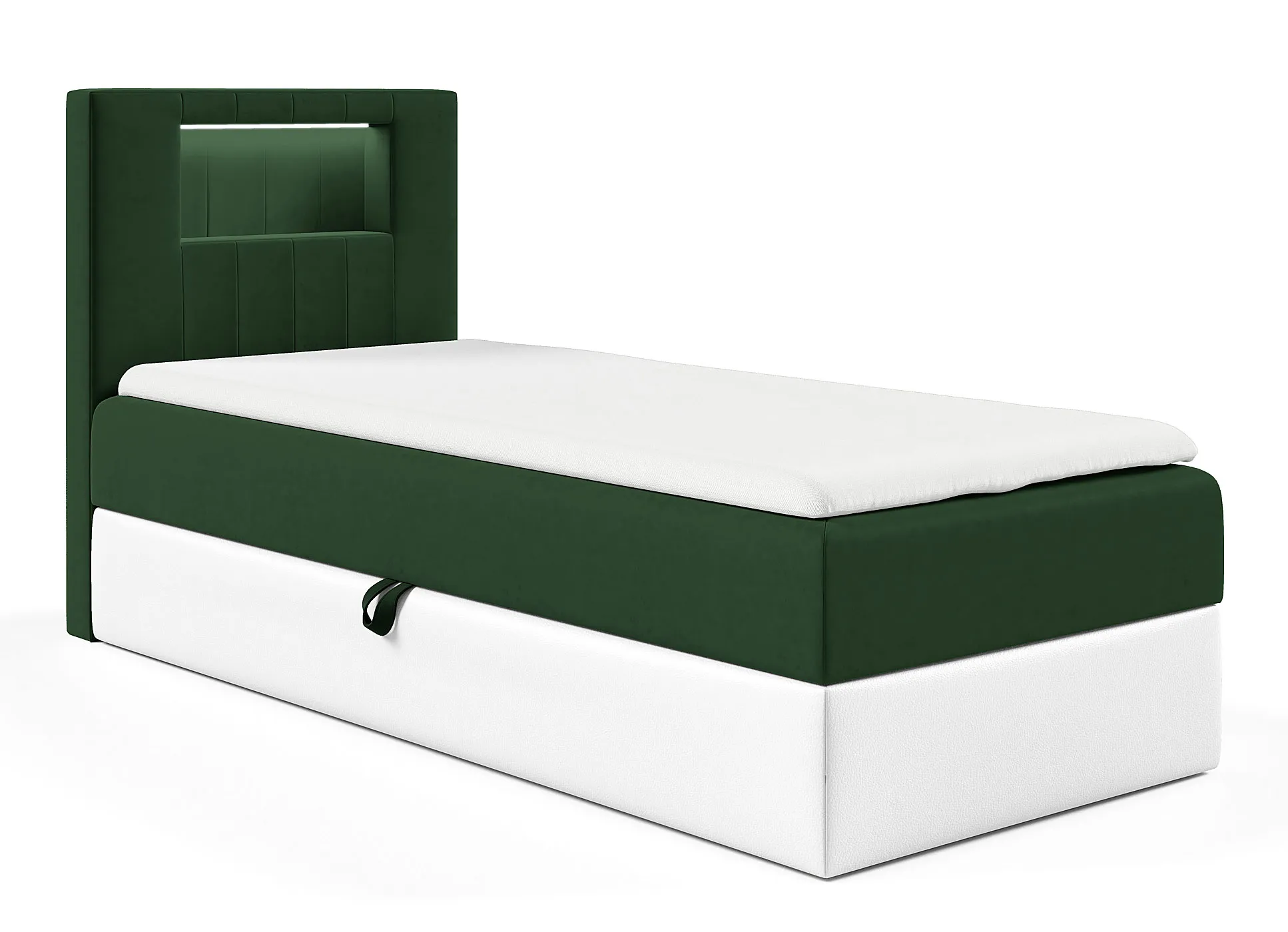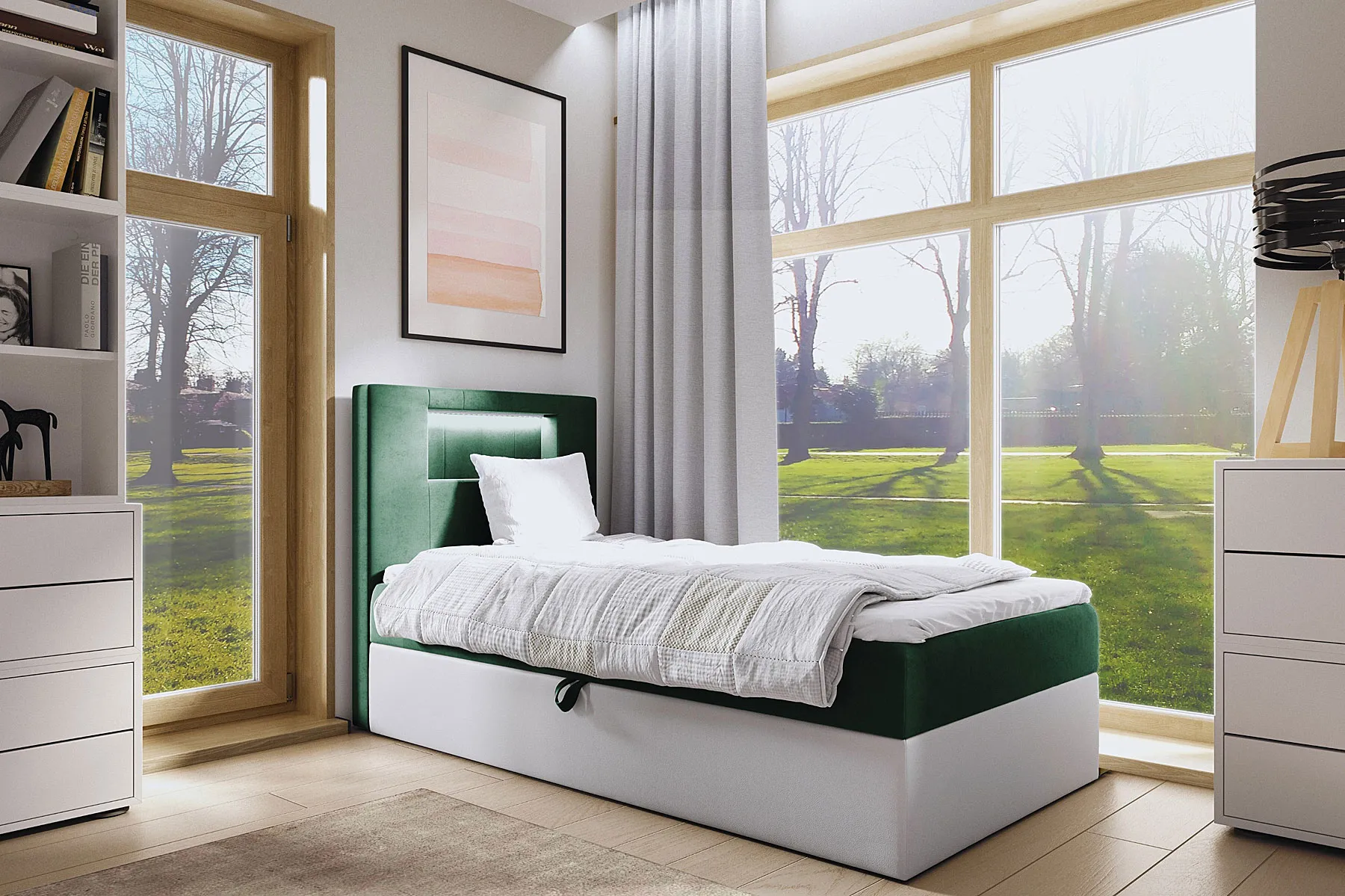 Łóżko Fenarro to nowoczesne i funkcjonalne rozwiązanie stworzone z myślą o codziennym komforcie. Prosta bryła i zagłówek z efektownym podświetleniem wprowadzają do wnętrza przyjemny nastrój i subtelny akcent nowoczesności. To pojedyncze łóżko idealnie sprawdzi się w pokoju młodzieżowym, gościnnym lub w niewielkiej sypialni, gdzie liczy się zarówno wygoda, jak i estetyka. Pod powierzchnią spania ukryty został pojemny schowek na pościel, który otwiera się lekko, dzięki automatowi na sprężynach. Możliwość wyboru strony otwierania pozwala dopasować mebel do układu wnętrza, a brak nóżek i zastosowanie ślizgów gwarantują stabilność i pełne dopasowanie do podłogi. Za wygodę odpowiada dwuwarstwowy system materacy – sprężynowy materac bonell zapewnia odpowiednie podparcie ciała, a topper z pianki T25 o wysokości 4 cm dodaje miękkości i podnosi komfort snu. Całość uzupełnia oświetlenie LED sterowane pilotem, które emituje chłodne, nastrojowe światło. To praktyczny detal, który podkreśla nowoczesny charakter łóżka i tworzy wyjątkowy klimat w pomieszczeniu.