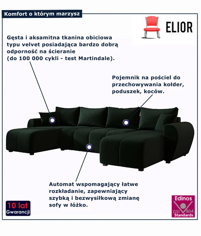 Wyobraź sobie salon, w którym każda chwila zamienia się w prawdziwy odpoczynek. Rano kawa z książką w ręku, popołudniu wspólna zabawa z dziećmi, a wieczorem seans filmowy z przyjaciółmi – wszystko w jednym miejscu, na jednym meblu. Narożnik rozkładany Aurelix 4X marki Elior to nie tylko część wystroju wnętrza, ale serce domowego życia. Jego imponujący kształt litery U otacza Cię miękkością, tworząc przestrzeń, w której każdy znajdzie swój własny kąt. To mebel, który łączy design, komfort i praktyczność, zmieniając codzienność w przyjemny rytuał.