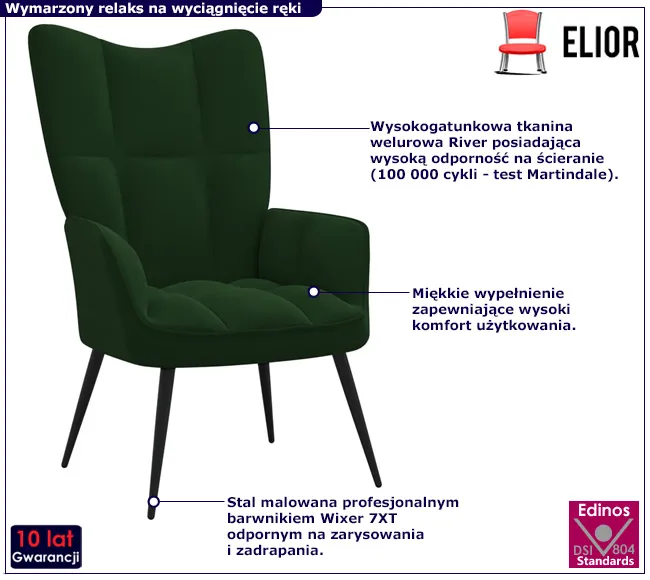 Fotel Verria marki Edinos Premium łączy ponadczasową elegancję z wygodą, oferując idealne miejsce do relaksu w nowoczesnym wnętrzu. Jego wszechstronna forma i stylowy design doskonale komponują się zarówno w salonie, jak i sypialni, podkreślając każdą aranżację. Nie czekaj, zamów fotel Verria już terazł! Powyższa oferta dotyczy fotela w kolorze ciemnozielonym w promocyjnej cenie 448 zł. Regularna cena tego mebla to 588 zł. Zamawiając go właśnie teraz zyskujesz aż 140 zł rabatu!
