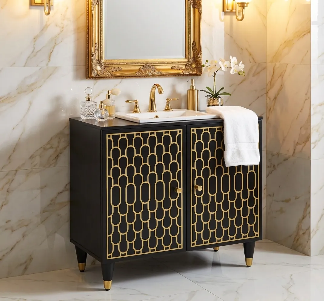 • Stylowe złote elementy wykończenia - złote, okrągłe uchwyty oraz nóżki dodają temu meblu szyku i prestiżowego wyglądu, pasującego do każdej stylowej łazienki.