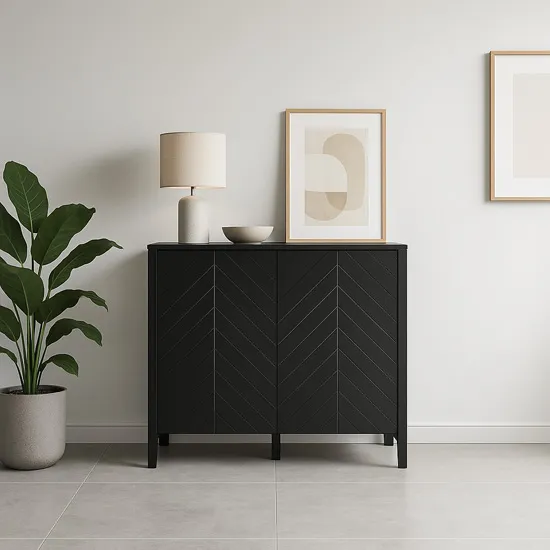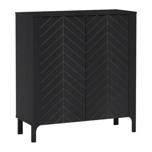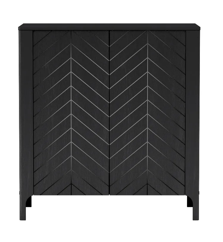 Komoda Serindo to połączenie stylowego designu z funkcjonalnością, która ułatwia codzienne życie. Dwie pojemne zamykane szafki pomieszczą wszystko – od ubrań, przez dokumenty. Czarne, matowe wykończenie i charakterystyczny wzór w jodełkę dodają elegancji, a smukłe nóżki wprowadzają lekkość do każdej aranżacji.