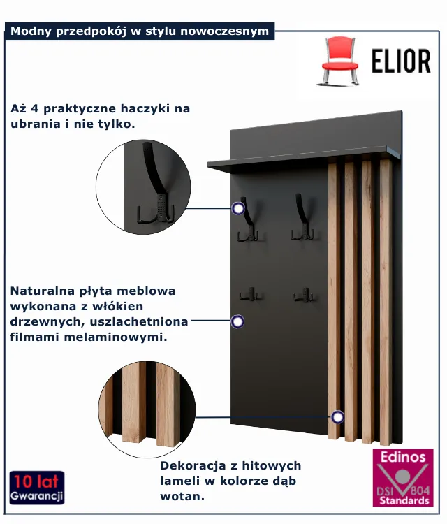Wieszak Crizzo świetnie odnajdzie się w jasnych, minimalistycznych wnętrzach, ale równie dobrze zagra w aranżacjach skandynawskich, loftowych czy nowoczesnych. Zawieś go nad szafką na buty lub ławką i stwórz praktyczną, stylową strefę wejściową. Wybierając wieszak Crizzo marki Elior, stawiasz na połączenie dobrego wzornictwa i codziennej funkcjonalności. To detal, który naprawdę robi różnicę. Zadbaj o wygodę i estetykę już od progu – wybierz wieszak Crizzo marki Elior w cenie promocyjnej 298 zł. Zainwestuj teraz i odmień swój przedpokój w kilka chwil!