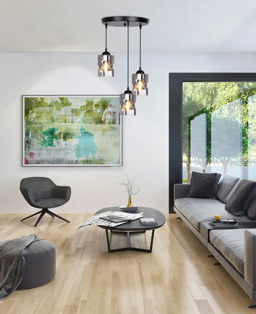 Wnętrze z wykorzystaniem nowoczesnej lampy wiszącej z 3 kloszami ze szkła dymionego Z026-Vido