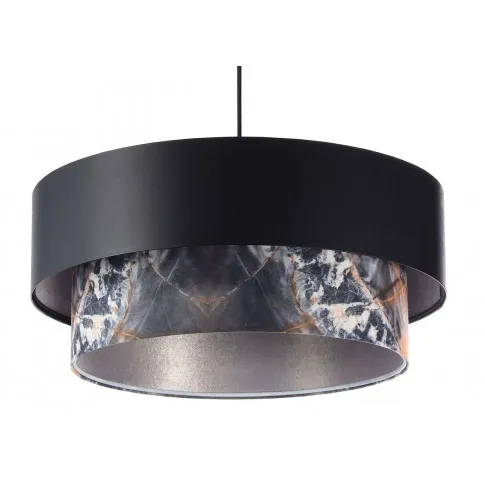 Materiał: abażur - tworzywo PCV pokryte czarną gładką tkaniną satynową, nadruk na tkaninie welurowej, wnętrze abażura - szara błyszcząca tkanina satynowa, podsufitka - metal