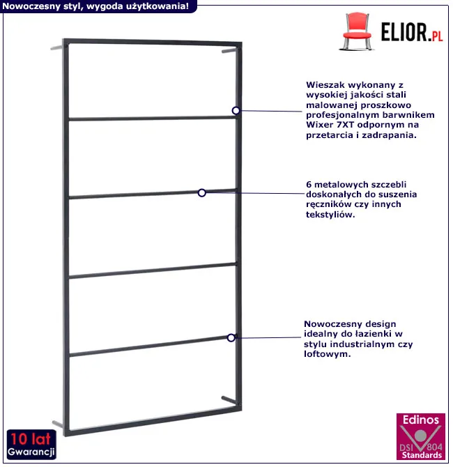 Ten nowoczesny wieszak Gambo 3X marki Elior wykonano z wysokogatunkowej stali pomalowanej proszkowo, odpornej na uszkodzenia mechaniczne i zadrapania. Dzięki aż 6 metalowym szczeblom możesz być pewna, że nie zabraknie miejsca na suszenie Twoich ręczników, a stylowy design stanowić będzie dodatkową ozdobę Twojej łazienki.