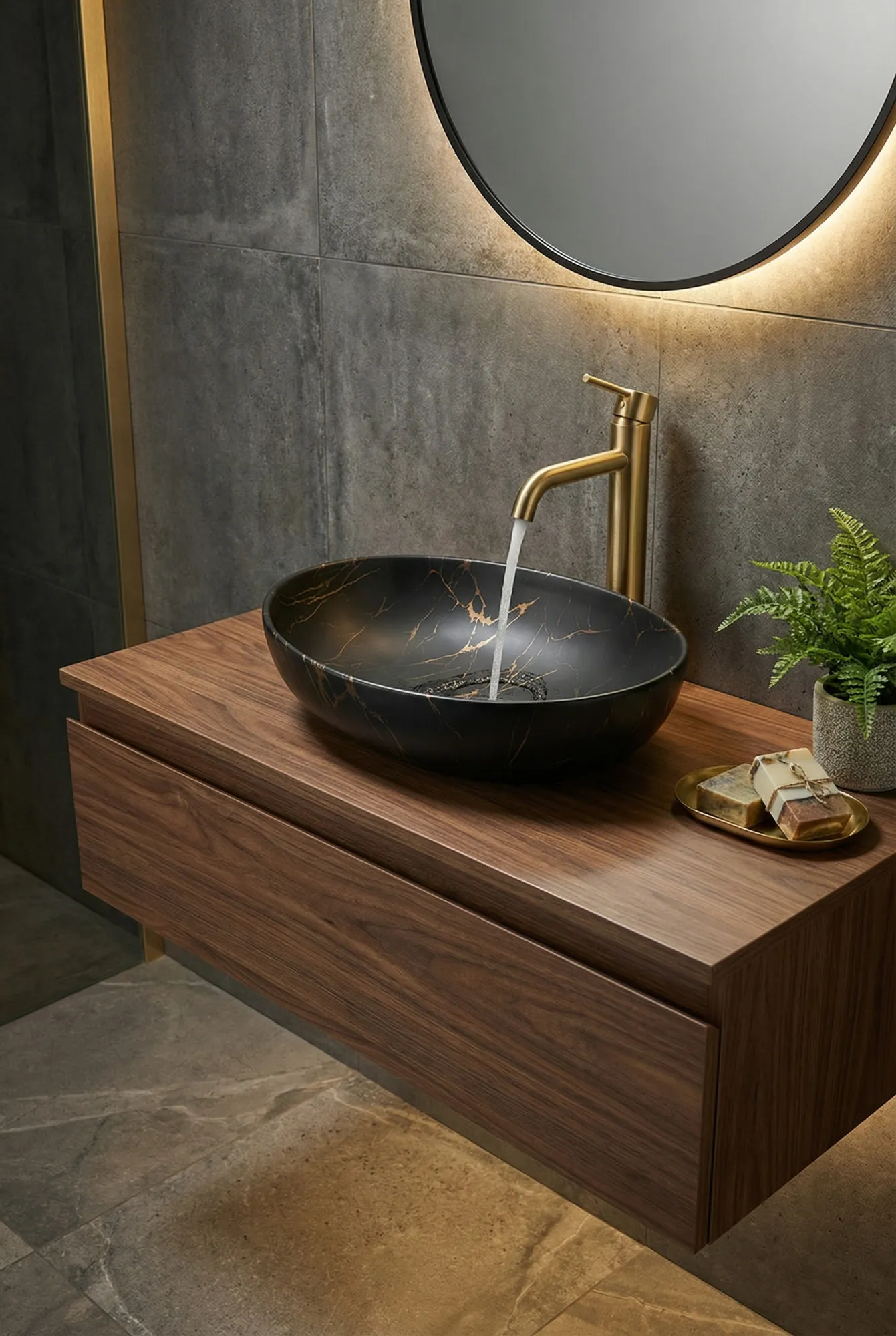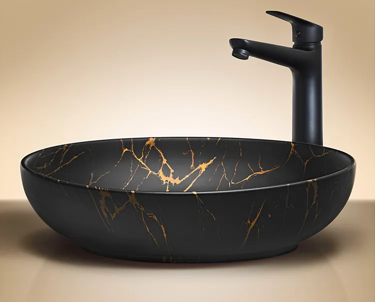 Jestem zachwycona tą umywalką! Jej głęboki, czarny kolor z subtelnym, złotym marmurkowym wprowadzeniem elegancji i luksusowego wykonania wygląda imponująco.