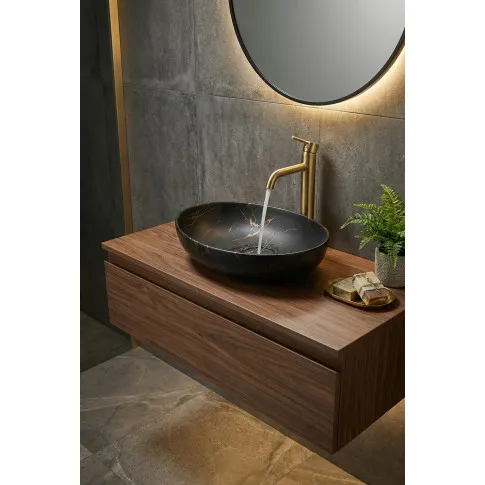Czarna umywalka nablatowa SMOKED marki Edinos Premium o marmurkowym wykończeniu to odważny wybór dla tych, którzy cenią sobie luksus i wyjątkowy styl w łazience. Jej głęboki, czarny odcień został uzupełniony subtelnym, złotym wzorem, który imituje marmur, nadając jej elegancji i ponadczasowego szyku. To połączenie sprawia, że umywalka staje się zarówno praktycznym, jak i dekoracyjnym elementem - wnosi do przestrzeni nutę glamour, nie tracąc przy tym na funkcjonalności.