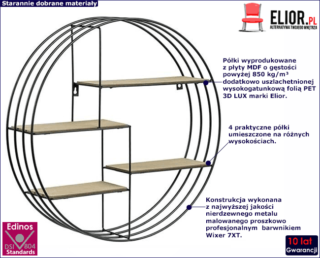 Półka wisząca Mulles marki Elior to doskonały element uzupełniający w aranżacjach w stylu industrialnym, loftowym czy skandynawskim. Minimalizm stworzony dla miłośników prostych, acz niebanalnych rozwiązań. 4 przestronne półki umieszczone na różnych wysokościach zapewniają wystarczającą ilość miejsca na wszystkie, nawet niewymiarowe przedmioty. Zawieś ją w salonie i zyskaj przestrzeń na książki czy kwiaty w doniczkach. Świetnie sprawdzi się w sypialni jako półka na zdjęcia lub w łazience, jeśli potrzebujesz miejsca na kosmetyki. Mulles to nie tylko praktyczne i stylowe rozwiązanie problemu braku przestrzeni, to także obietnica wysokiej jakości oraz wieloletniej trwałości. Połączenie najlepszych materiałów - nierdzewnego metalu malowanego proszkowo oraz płyty MDF sprawiają, że półka jest niesamowicie trwała i z pewnością będziesz mógł używać jej bez obaw przez lata! Okrągły kształt i nieregularnie ustawione proste półki sprawiają, że mebel posiada duże walory estetyczne, jak i praktyczne. Zapewnij sobie wysoką funkcjonalność połączoną z niebanalnym, nowoczesnym stylem.